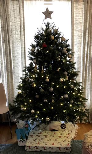 As usual, the tree arrived on time. Putting it on your stand was a breeze. It looks lovely and is perfectly shaped and just the right size. Evidently, during shipping it was stood on it’s ‘head’! The top branch – for a star, a bow our whatever was laying forlorn in the carton. However, using a hot glue gun, it has a top! Thank you for sending me another beauty – that’s three years running I believe. Keep up the good work.